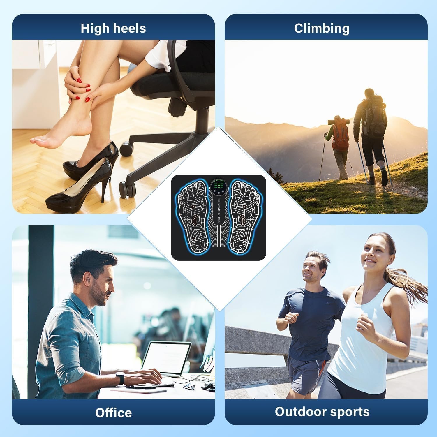 - Powerful Foot Massager: Circulation foot massage uses EMS technology which provides different treatment methods and strengths for your soles and body. Electrical Muscle Stimulation (EMS) is a protocol that elicits a muscle contraction using electrical impulses that directly stimulate your motor neurons. This foot massage circulation will help you promote blood circulation and relax the feet.